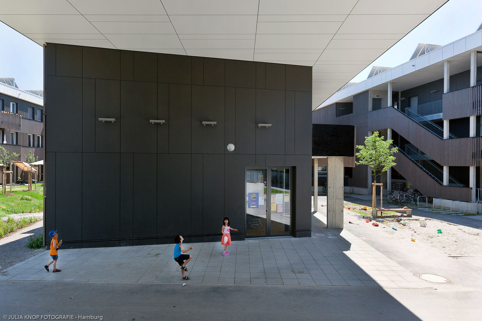 Analog zu den strengen Anforderungen für energieeffizientes, zukunftsweisendes Bauen wurden auch die Außenanlagen unter dem Gesichtspunkt der Nachhaltigkeit entworfen. Zentraler Bestandteil ist ein Entwässerungskonzept, das den Niederschlag oberflächennah versickern lässt. Konkret geschieht dies über ein System aus Wasserrinnen, Sickermulden und Röhrichtgürteln, die das Quartier über ihre Funktion hinaus auch gestalterisch aufwerten.