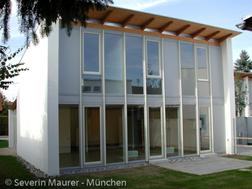 Konstruktiv wurde eine konventionelle Mischbauweise gewählt Außenwände 36.5cm Ziegelmauerwerk, beidseits verputzt, Bodenplatte und Decke über EG aus Stahlbeton, Dach und Südfassade als Holzkonstruktion.
