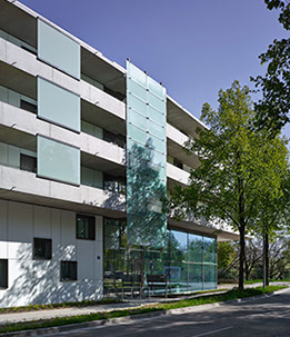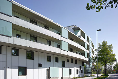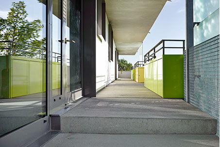 Alle Aufenthaltsräume sind dabei zum ruhigen, grünen Innenhof orientiert und von „laut nach leise“ zoniert. Jede Wohnung hat einen sehr großzügigen Freibereich (Garten oder Loggia). Alle Wohnungen sind barrierefrei nach 18040 Teil 2, wobei 30% der Wohnungen behindertengerecht nach Teil 1 ausgeführt sind. Die Schlafräume sind mit mind. 15m² über dem Standard im sozialen Wohnungsbau und somit flexibel belegbar. Zusätzliche Arbeits- und Spielbereiche in den Puffer-Flurzonen bieten zusätzliche Aufenthaltsmöglichkeiten.