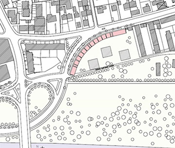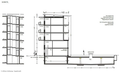Die drei Treppenhäuser gleichen den Geländeversatz von 1,20m aus und erschließen das Gebäude wirtschaftlich und barrierefrei. Unter dem Kopf der Schwinge ist außerdem ein Fahrradweg parallel zur Donau in Richtung Stadtmitte angeschlossen.