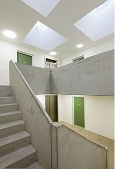 Die identitätsstiftende Zonierung der Zwischenräume setzt sich im Inneren des Hauses fort: die kompakte Bauweise als Vierspänner ergibt ein großzügiges Treppenhaus mit Oberlicht, welches mehr als nur Verkehrsfläche ist und zur kalten Jahreszeit die Spielflächen der Kinder erweitern kann.