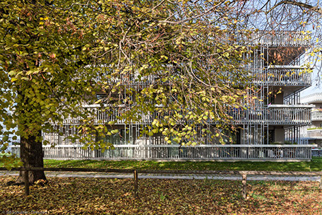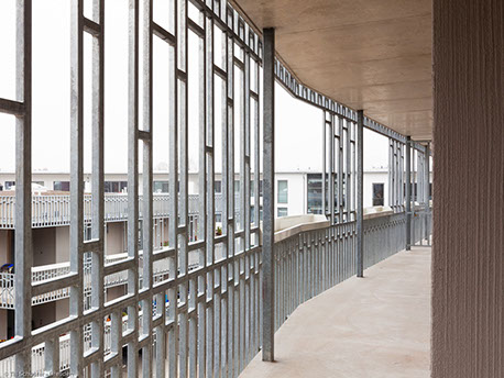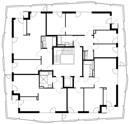 Jede Wohnung besetzt eine Gebäudeecke des Solitärs und ist so in zwei Himmelsrichtungen ausgerichtet. Über Eingangsdielen, die zusammen mit den Bädern eine Schicht um das Treppenhaus bilden, gelangt man in die Wohnräume. Allen vorgelagert ist eine umlaufende Veranda, die einen privaten Außenraum und eine schützende Zwischenzone bildet. Sie legt sich um die Zimmer, weitet und verengt sich und bietet mal mehreren Personen Platz , mal wird sie zum Rückzugsort für den Einzelnen. Gleichzeitig ist sie ein wohnungsinterner Weg im Freien mit Ausblicken in die Landschaft.