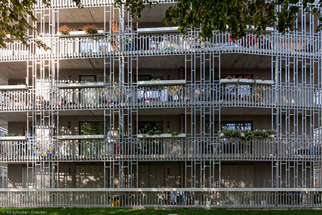 Die drei Punkthäuser liegen auf Garteninseln im grünen Wohnhof, der sich mit der angrenzenden Parkanlage und der Flussaue verbindet. Der Landschaftsraum der Donauniederungen fließt bis zur straßenbegrenzenden Bebauung. Die Inseln sind zum Gebäude hin angehoben, wodurch sich der private Bereich vom halböffentlichen absetzt und der Freiraum zoniert wird. Es entstehen Aufenthaltsbereiche, Platzsituationen, Sitzecken und Spielplätze, Orte um zu beobachten und um sich zurückzuziehen.